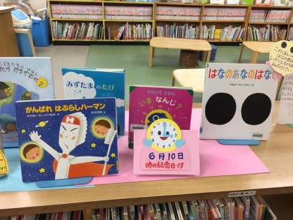 6月4日は虫歯予防デー、6月10日は時の記念日です。図書室では、木曜日に来ていただいている図書館補助員の方に専門コーナーを作っていただきました。かわいらしく展示していただいています。ぜひ、読んでみてくださいね。