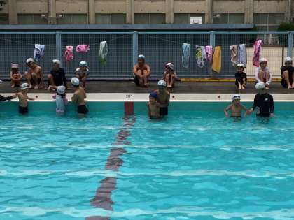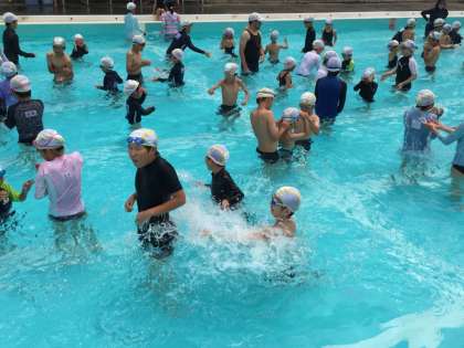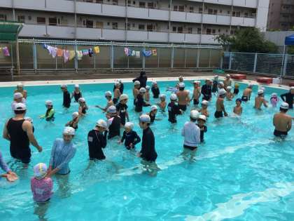 今日、1年生は、小学校生活最初のプールの授業がありました。6年生のお兄さん・お姉さんたちと一緒に入り、ルールやマナーを教えてもらいました。6年生は1年生のお世話を一生懸命してくれました。1年生は横に頼れるお兄さん・お姉さんがいてくれて、とても楽しそうにプールに入っていました。次の授業では、すぐ上の2年生とプールに入ります。少し、寒かったかな?6年生の皆さん、1年生のお世話ありがとう。