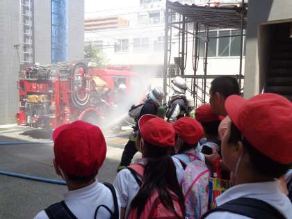 実際に消防車に触れて説明を受けたり、消火活動を見せていただきましたが、その迫力に子ども達も驚いているようでした。消防署の方々は、人の命を守るため、体を張って危険なことにも立ち向かっておられることがよくわかりました。