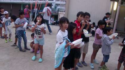 夕食は地域・保護者の方々が作ってくださったカレーライスです。一人が2杯も3杯も食べるほど美味しかったです。その後には、ファイアーを囲んで、歌やダンスで盛り上がっています!