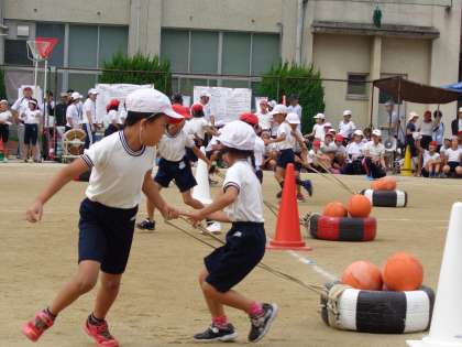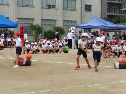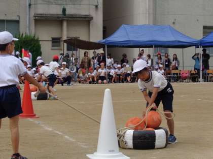 3年生のひっぱれ!タイヤ(団体競技)です。タイヤから何度もこぼれるボールを拾いながら、子ども達は全力で頑張りました。