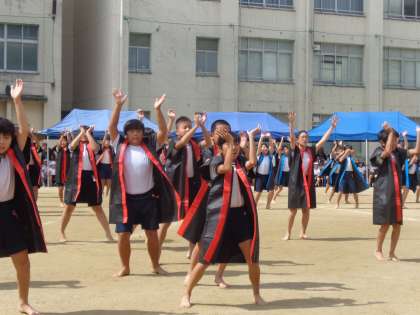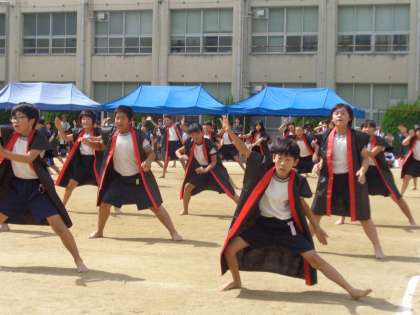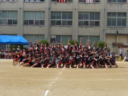 同じく5・6年生の『新東三国ソーラン』の後半部の踊り、ソーランです。自分達で作ったハッピの裏に名前の1文字を入れ、威勢のいい踊りがみんなの目をくぎ付けにしていました。