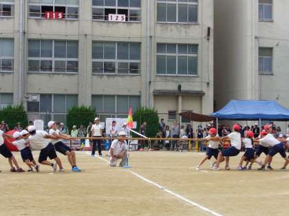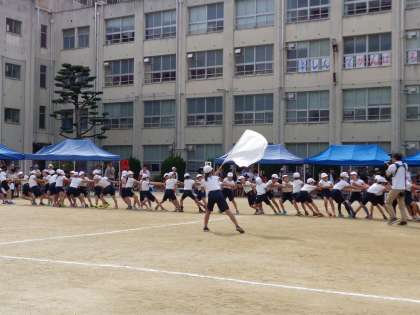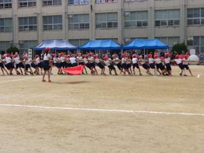 全学年による綱引きです。2つの学年ずつがペアを組んで、紅白で試合をしました。上級生の気遣いとリーダーシップが光っていました。