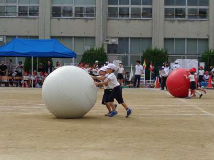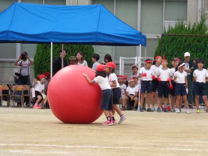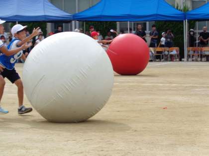 2年生の、みんなでコーロコロ(大玉転がし)の様子です。大玉が前にあると、2年生には大きすぎて前方が見えないほどでした。だけど、全員、気合で見事に大玉を操りました。