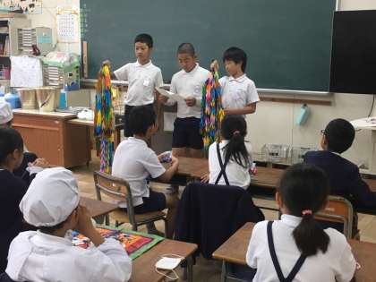 6年生は18日(水)より修学旅行で広島へ行きます。その際、全校生徒で折った折鶴を6年生が代表して広島の爆心地に届けます。6年生が給食の時間、みんなで作った折り鶴を持ってきて披露してくれました。