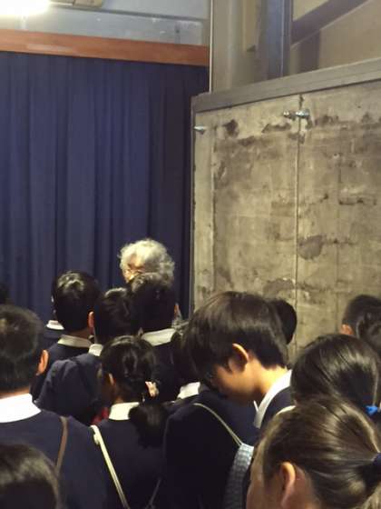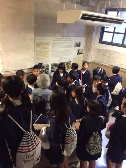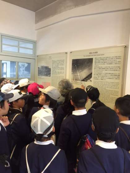 袋町小学校で、被爆後の人々が遺した筆跡などの説明を受けています。