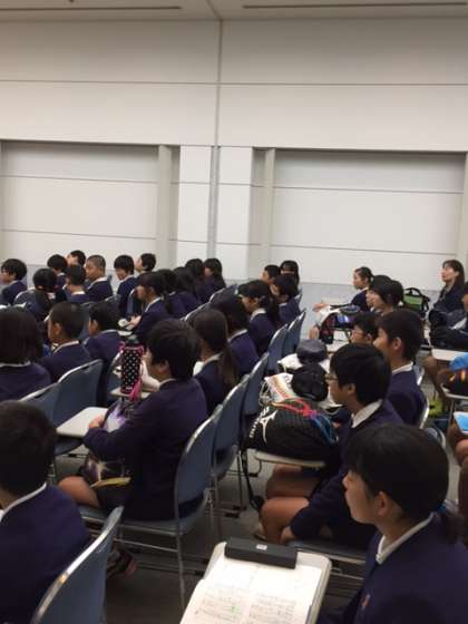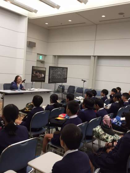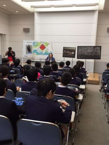 平和記念資料館で語り部さんの講話を真剣に聞いています。