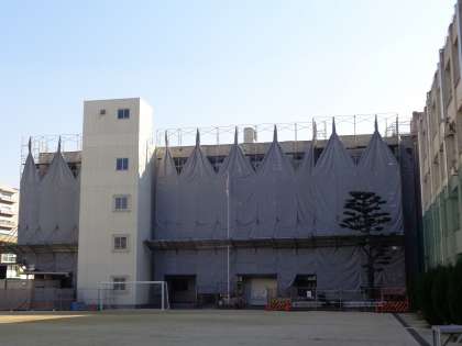 本校の中央館の外壁が補修しています。築36年になる校舎も、当然のこと、あちこちがほころびてきています。今年度は中央館の外壁を洗ったり、削ったりしたうえで、キレイに塗装していきます。いろいろ、子ども達にも不便なこともあるかもしれませんが、1月末までには完成し、みんなが「美しい!」と思えるものになると期待しています。