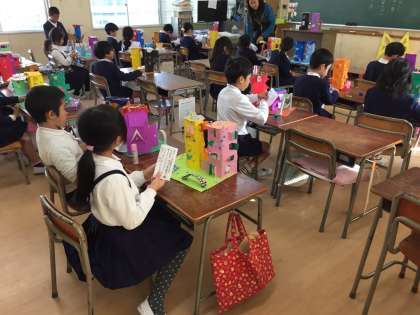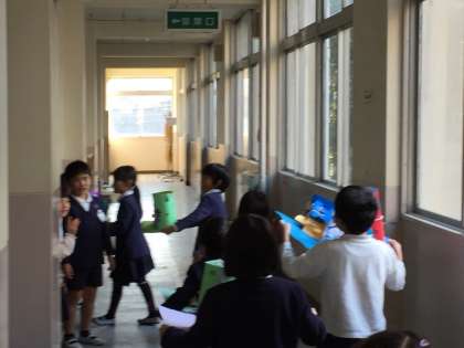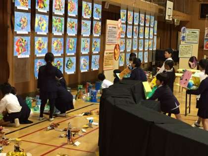 今日も作品展の準備の様子です。今日は立体作品の搬入を行っています。自分の作品、すでに展示している作品を壊さないように、丁寧に運んでいます。先生も子供もピリピリです。