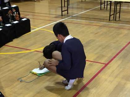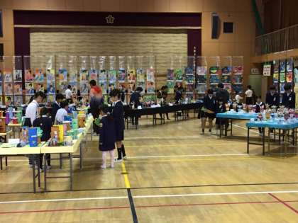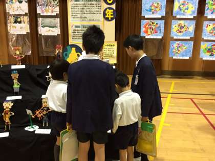 子ども達は、16日(木)と17日(金)で作品展の見学をしています。今日、6年生は1年生と一緒に見学しました。6年生が1年生に、作品の説明をして、1年生はそのことをメモしています。1年生はとても真剣に6年生の話を聞いていました。1年生を楽しませようと、たくさんお話をする6年生もいました。みんな、楽しそうでした。