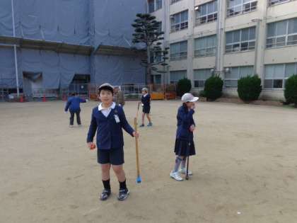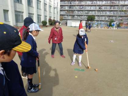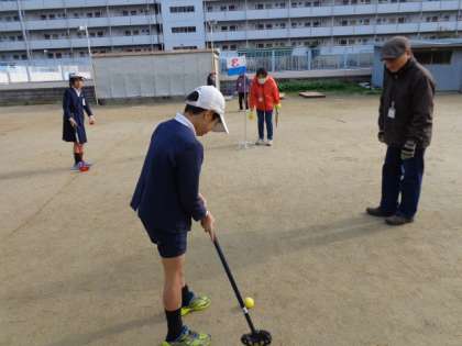 4年生では、地域の友和会に皆様とグランドゴルフを行いました。友和会の皆様がやさしく教えてくださるので、最初はうまくいかなかった子どももやがて上手になり、本当に楽しそうに活動することができました。