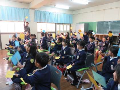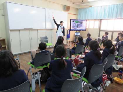 本日は、地域にお住まいで薬剤師をされている方をゲストティーチャーにお招きし、『くすりの秘密』というタイトルで講習をして頂きました。薬を作ったり、扱ったりするプロの薬剤師さんはどんな仕事をしているのかを教えて頂いたり、聴診器で自分の心臓音等を聞かせて頂いたりしました。薬についてクイズ形式でも楽しく学べて、とても有意義な時間でした。