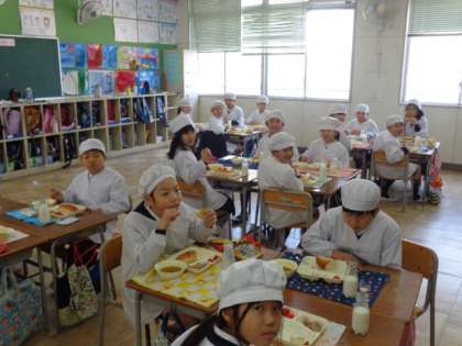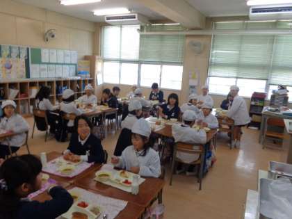 本日、全校で交流給食が行われました。1年生と6年生、2年生と4年生、3年生と5年生がそれぞれの教室で一緒に給食を食べる取組みです。低学年は高学年のお兄さんやお姉さんから手際よい給食の準備の仕方や給食時のマナーを学びました。そして、異学年で楽しく過ごす給食の時間はお互いの心を豊かにしたようです。