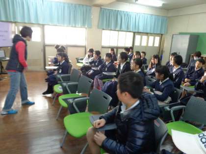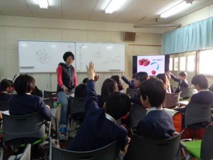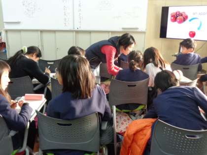 こちらは、後半(高学年の部)です。ここでは、食べ物や様々な物の単数形、複数形などの言い方、使い方などを視聴覚やペアでの発表などによってわかりやすく教えていただきました。実際に英語を使う国々に行っても、身近な感覚で慣れ親しめるようになれる授業でした。子ども達にとっては、とても貴重な時間だったようです。