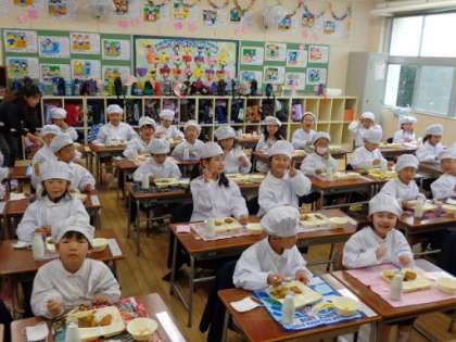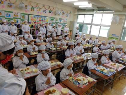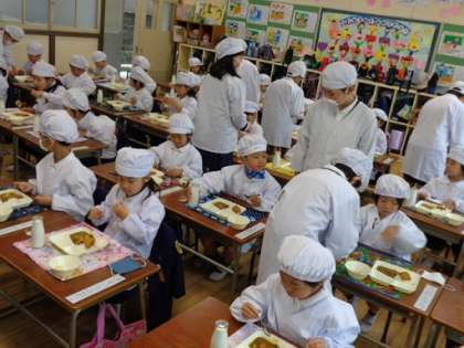 1年生が小学校の給食の2日目を迎えました。本日の献立は“入学お祝い膳”で子ども達の大好物のカツカレーライスやデザート(果物の缶詰)などでした。しばらく、6年生が給食を運ぶことや配膳などを優しく手伝ってくれます。1年生の嬉しそうな表情が給食の美味しさ、楽しさを表しているようです!