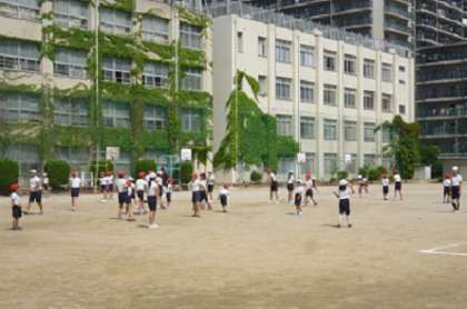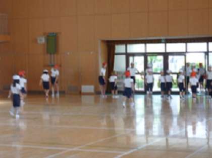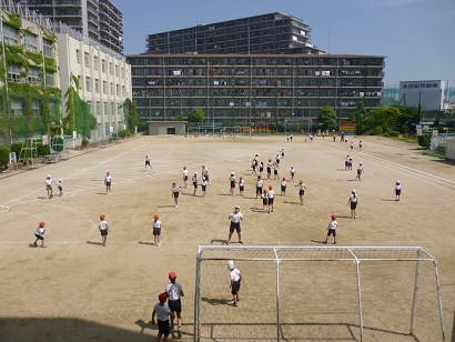 走り終わると、次の「ソフトボール投げ」のために、6年生が1年生にボールの投げ方を教えていました。