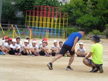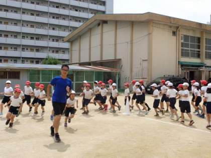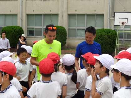 本日2・3時間目に夢・授業が行われ、陸上競技で世界を相手に戦ってこられた荒川大輔選手と宮川洋也選手が来てくださいました。写真は2時間目の4・5年生ですが、準備運動の仕方から、速く走ることができるためのポイントまで、とてもわかりやすく教えてくださいました。また、実際に、すごい迫力の動きを見せてくださることは、子ども達にはとても素晴らしい刺激になりました。