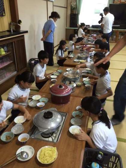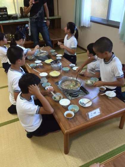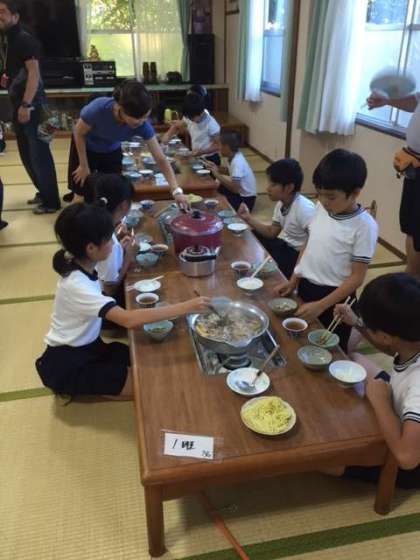 晩ごはんが始まりました。美味しいカモ鍋を子どもたちが大喜びで、競うように食べています!