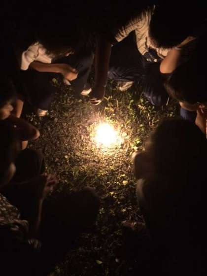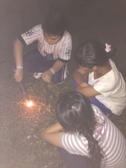 キャンプファイヤーの終わりに、子どもたちは、キレイな花火にうっとりしています。