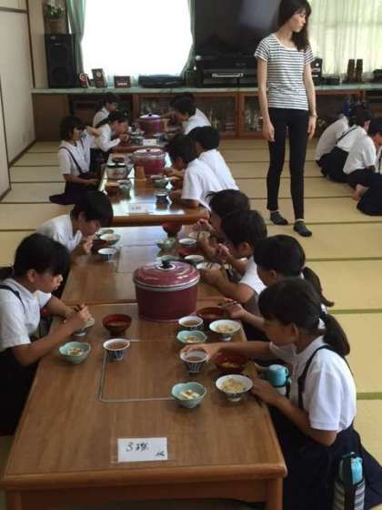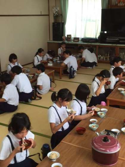 いよいよ、林間学習最後の食事となりました。にゅう麺に、お豆腐、炊き込みご飯ですが、すごい勢いで食べています。