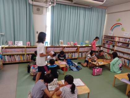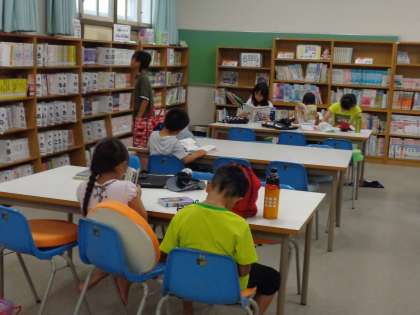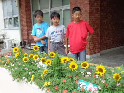 今日は夏休み図書室開放の様子をご紹介します。読書が好きな子ども達は、ひたすらに本を読んだり、本について語り合ったりしています。この良い盛り上がりはずっと大切にしたいものです。また、玄関の花(ミニひまわり等)は“今が最盛期”みたいな感じで咲き誇っています。それを見つめる3人の少年たちです。