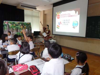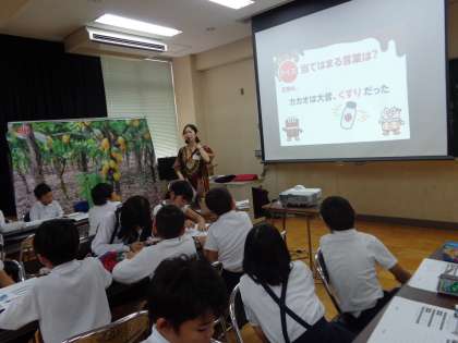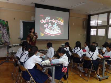 本日の2時間目、4年生では食育教育の一環として、『明治』から講師を招き「発見!チョコレートのひみつ」と題した出前授業を行いました。チョコレートの原材料であるカカオの原産地やチョコレートになるまでの過程についてもクイズ形式を交えて教えていただきました。また、チョコレートに含まれる栄養について、ポリフェノールには血管を健康にするなどの内容に触れましたが、「チョコレートの原材料のカカオには、もとはクスリ」としての役割があったことの説明には子ども達の驚きが見られました。