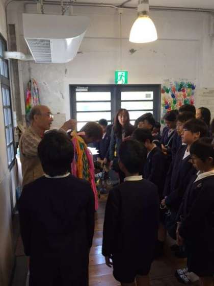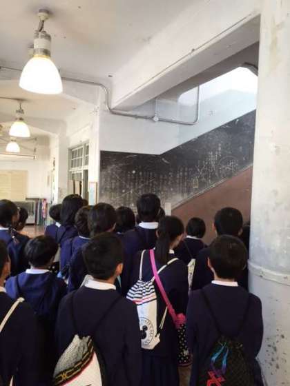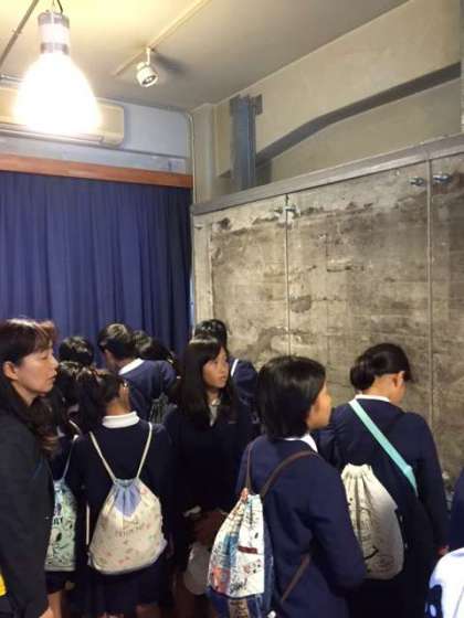 袋町小学校に到着し、被爆時のお話を聞いたり、当時の被爆された方々が壁に書いた伝言などを見ています。みんな、神妙な様子で鑑賞しました。