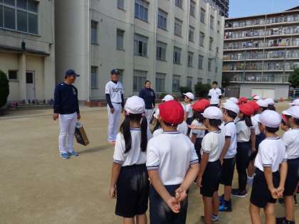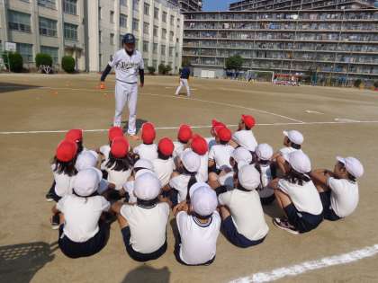 本日の2〜3時間目、3年生では夢のような出前授業が行われました。プロ野球の元オリックスブルーウェーブの塩崎選手、大久保選手、プロのトレーニングコーチの小澤コーチ、そして北京オリンピックでソフトボールで金メダル(上野の413球)に輝いたキャッチャーの乾選手が来てくださいました。ティーボールを中心に教えていただきましたが、試合形式なども交え、本当に楽しく有意義な時間でした。