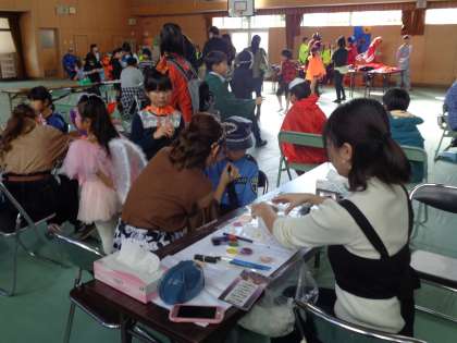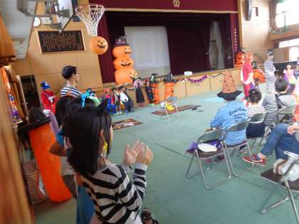今年度も本校の講堂でPTA・地域共催の『ハロウィンde防犯』が開催されました。これは、ハロウィンパーティーをしながら、子ども達に防犯クイズを解かせるなど、防犯の学習も行うものです。おなじみになった淀川区住みます芸人『職人』もお二人によるゲーム大会、PTAによる防犯クイズや仮装コンテストが行われ、大盛り上がりでした。ボランティアで子ども達にメイクをしてくださったベルエベル専門学校の方々にも、とても感謝しています。