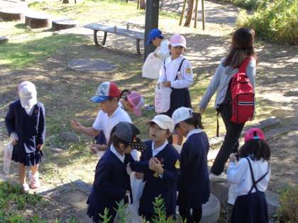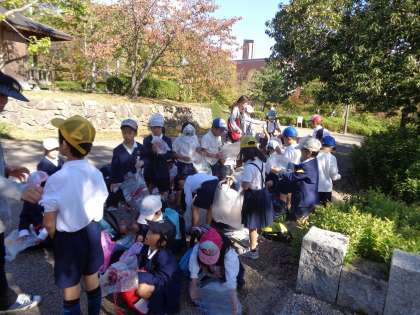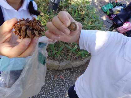 本日、1年生が秋の様子の学習の一環として、吹田市の片山公園にドングリ拾いに行きました。ポカポカ陽気の中、子ども達はイキイキとドングリや紅葉となった落ち葉、松ぼっくりなどを集めました。そして、持参した「せいかつ科」の教科書に載っているドングリの種類などを自分の拾ったものと照合したりして楽しく学習していました。