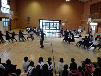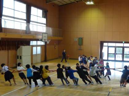 小小連携の取組の後半では、本校が運動会で行った4方向に引き合う綱引きを行いました。一生懸命、縄を引き合う中でお互いに打ちとけ、親しさが増してきたようです。これからも、学校は違えど、友情を育み、そして、切磋琢磨してお互いを磨き合う仲になってほしいものです。