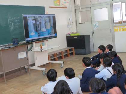 3年生は、社会科で工場で生産される物の仕事について学習しています。今日は、株式会社キューピー大阪支店の方々から、マヨネーズの材料や、マヨネーズを使った料理のワザなどのお話しと、マヨネーズの作り方を教えていただきました。まず、DVDで工場でマヨネーズが生産される様子を見て、1分間に600個の卵を割ることができる機械のスピードにびっくり。