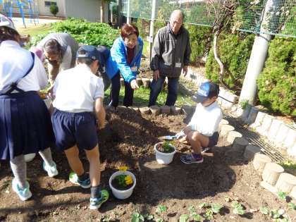 今年度も地域の友和会の皆様にご来校いただき、2年生の花の植え付けをご支援して頂きました。見事な黄色のパンジーを友和会の方々に教えていただき、2年生の子ども達は嬉しそうに自分の鉢にパンジーを植えます。温かい会話のやり取りも含め、素晴らしい思い出になると共に、普段からの地域での交流も深くしてくれると期待しています。