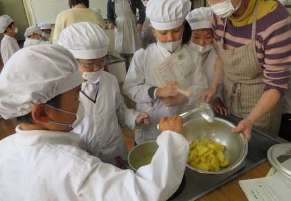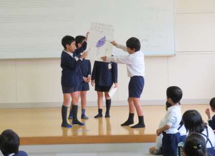 2年生は、さつまいもをつぶしたり、ねって丸めたり、たまごをぬったりして大活躍!洗い物もきちんとできました。全員で小さなスイートポテトが200個以上もできあがりました。4時間目には、参加してくださった保護者のみなさんと、1年生を招待してみんなでおいもパーティを開催。2年生が司会をして「おいもクイズ」で盛り上がっていました。