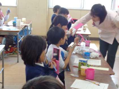 虫歯になる原因の歯垢はどのようにしているのかを教えていただきました。それを実際に自分の歯で確認するために、先生がみんなの歯に試薬を塗ってくださいましたが、歯垢の部分がピンク色になって驚きました。それを正しい歯磨き方法でとっていきましたが、各自が歯ブラシと鏡を持って大奮闘でした。