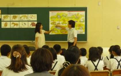 本校は空調設備のある教室が限られているため、今回は、多目的室で、2年、4年、5年の3つの学年の指導の様子を見ていただきました。