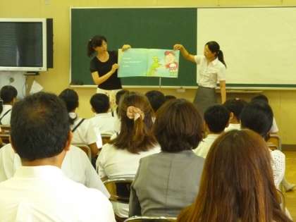 緊張した面持ちで登場した子どもたちでしたが、学習が始まると、いつも通り元気いっぱい歌ったり会話したり。とても頑張っている様子を見ていただきました。