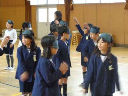 本日、3年生は午前中にブラインドサッカーに取組みました。ブラインドサッカーはキーパー以外は目で見てプレイすることはできないサッカーです。それだけに、神経を集中し、お互いの声を掛け合い、ひと時も気を抜けないものです。子ども達は今日、来てくださったお二人の講師の楽しくわかりやすい指導のもと、その素晴らしさを感じていたようです。また一つ、子ども達の世界がひろがりました。
