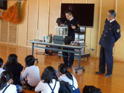 本日、4年生が社会見学として淀川消防署に行きました。最初は講堂で消防署のお仕事や先日、札幌で起こった爆発火災事故に関して、スプレー缶の危険さを実験を交えてご説明いただきました。2人の署員の方々の熱心なお話を子ども達はとても集中して聞き入っていました。