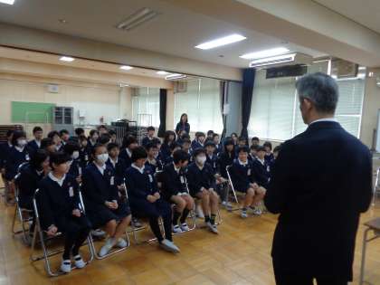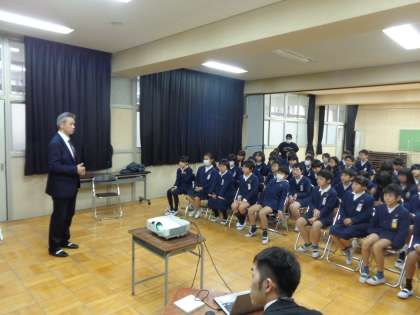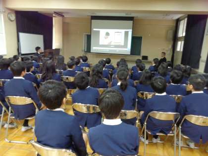 もうすぐ中学生になる6年生が、今後ますます広い世界で活躍するためには、様々な危険を回避することも重要なことです。そこで、本日は淀川警察署から2人の刑事さんを講師にお招きし、スマートホンに潜む危険な落とし穴などについて教えていただきました。6年生は全員が姿勢正しく、真剣に話に聞き入っていました。これからの人生でも、この態度があれば大丈夫だな、と思える時間でした。