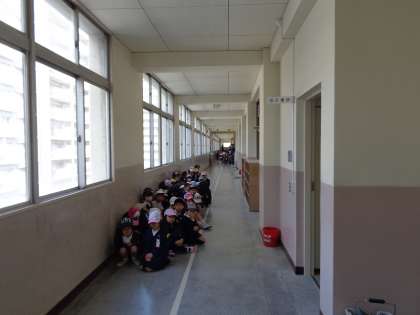2時間目には、全校で避難訓練に取り組みましたが、今回は地震と津波を想定してのものでした。地震が起こったあと、机の下に身を伏せ、安全管理が整えば運動場に素早く避難します。その後、津波を想定しますが、津波に関する専門家によると、今後、起こる可能性がある南海トラフ地震では淀川区に最大4mの地震も予想されています。これは、校舎の3階に該当する高さですが、子ども達は全員4階まで駆け上がる訓練をしました。地震や津波は起こってほしくないですが、命を守る日ごろの訓練は決して欠かせません。