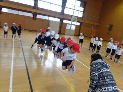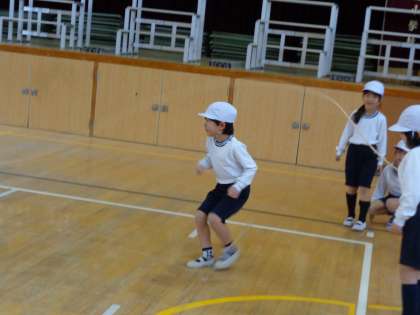“大波、小波 ぐるっと回ってニャンコの目♪”と講堂から楽しい歌声が聴こえてきます。中では、1年生が雨天のため、運動場での体育を講堂に移して大縄跳びに取り組んでいました。みんなで歌いながらリズムを取って、息を合わせながら上手に跳んでいます。楽しく、リズミカルに行う体育も子ども達の成長に必要です。