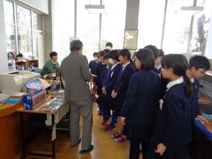 校内の施設見学では、同校卒業生の手塚治虫さんの残した貴重な漫画などを集めたギャラリーや、非常に多く重要な蔵書の揃った図書館などを見せて頂きました。また、太平洋戦争時に機銃掃射によって穴の空いた校舎の壁や、焼夷弾で犠牲になった高校生の供養碑などを見た子ども達は、北野高校の抱える多面的な歴史についても感慨ひとしおだったようです。恵まれた教育環境と先輩たちの残した立派な歴史、在校生の素晴らしい活動などを知った本校の6年生は、将来、何人もが北野高校の生徒になるような気がしました。