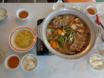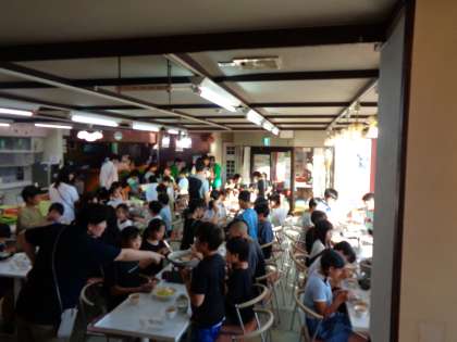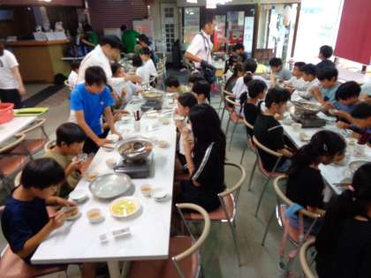 夕食は鴨鍋です。楽しみにしているキャンプファイヤーへ向けて、しっかりと腹ごしらえをするため、鴨鍋をもりもり食べています。