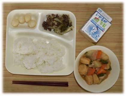 今日の給食は『月見の行事献立』で、一口がんもとさといものみそ煮とみたらし団子、牛肉と野菜のいためものでした。