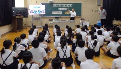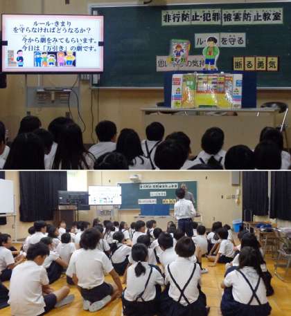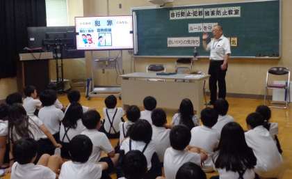 「非行」とは悪い行いのことで、法律やルールを破る行いのことです。社会のルールを守る大切さや、人を思いやることが大事なこと、いけないことを断る勇気が必要なことなど、スライドショーやペープサートを使って分かりやすく説明していただきました。