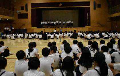 今朝の児童集会で、「図書委員会の発表」があり、5・6年生の図書委員による本の読みきかせが行われました。