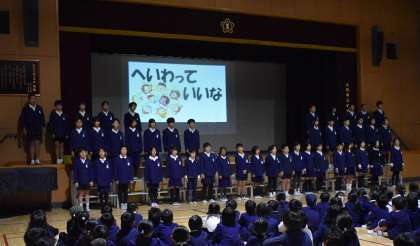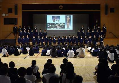 今朝の児童集会で、6年生が「修学旅行報告会」を行いました。