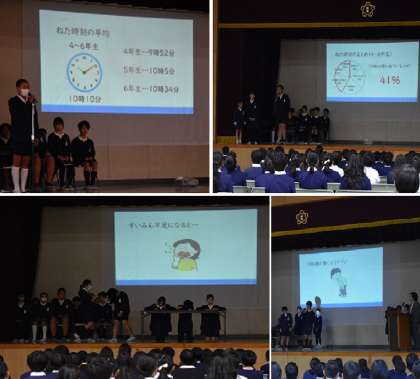 保健委員会からは、アンケート調査の結果をグラフなどで示しながら、眠ることの大切さなどについて発表がありました。運動を十分にしたときの眠りの様子や、ゲームをしてから寝たときとゲームをせずに寝たときを比べる実験、「よい眠りを得るための」の体操コーナーも!
