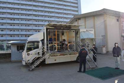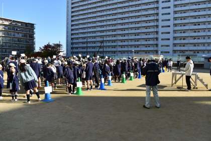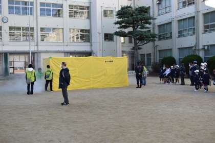 新東三国小学校地域合同防災訓練の様子です。淀川消防署、淀川区役所、新東三国社会福祉協議会の方たちの協力のもと、煙中体験、起震車、可搬式ポンプ訓練、胸骨圧迫訓練を行っています。中学校からもたくさんのジュニアリーダーがサポートしてくれています。